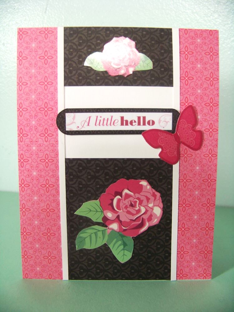 Next up are the 5 x 7 sized cards. For this one, I took a piece of the AS and used it for the background. I cut another piece of it for a border at the top, and added one of the die cuts for the focal. The sentiment was pieced from some pieces I found in my stash.